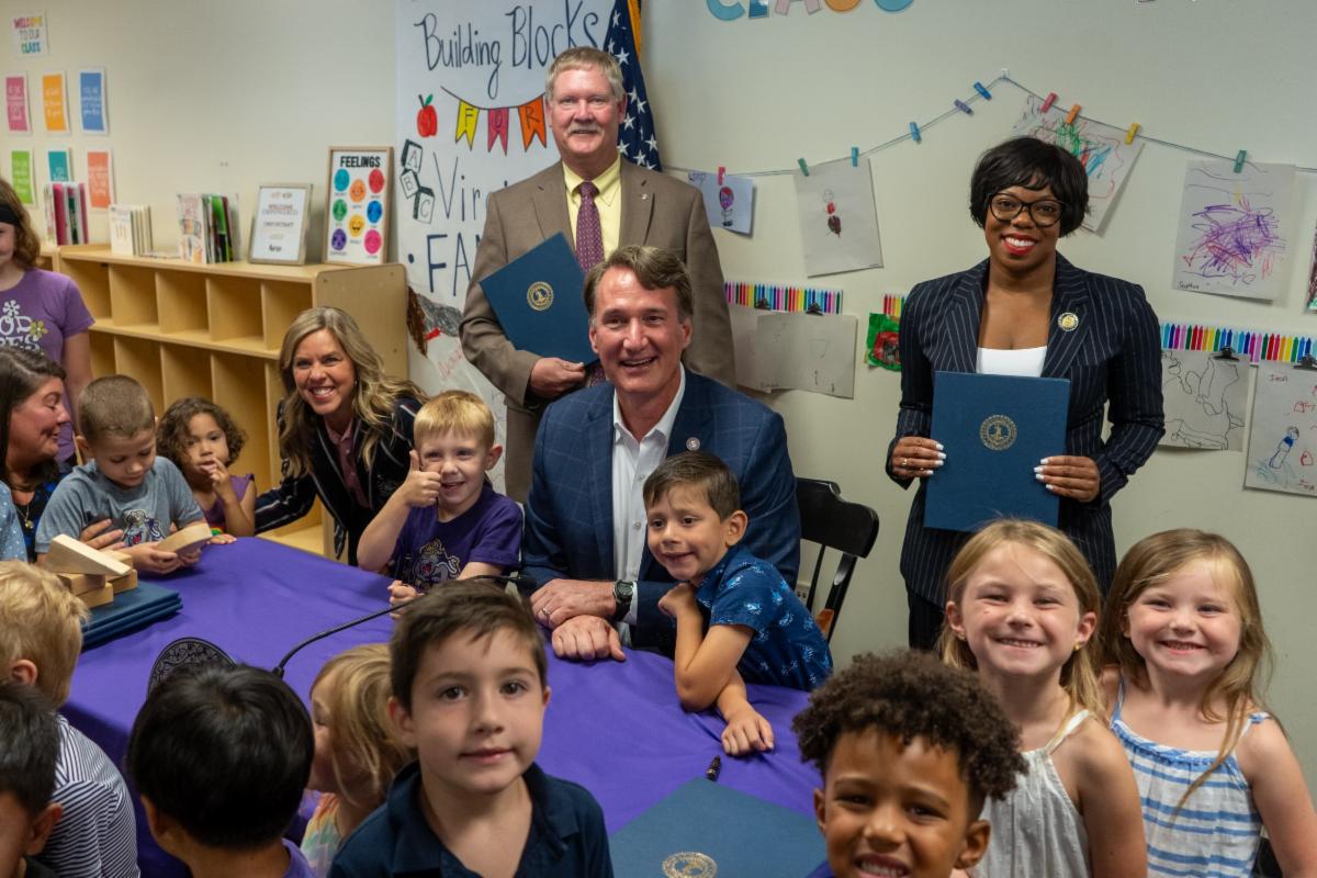 RICHMOND, VA – Yesterday, Governor Glenn Youngkin signed ten bipartisan bills, marking a pivotal milestone for Building Blocks for Virginia Families, an initiative designed to expand available child care options and empower working families across the Commonwealth by ensuring parents have the support they need to thrive in today’s workforce. This historic moment for Virginia families took place at Anthony Seeger Hall at James Madison University, home to the JMU Young Children’s Program, an early learning center that serves children ages two to five years.