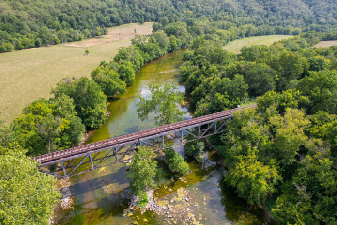 An aerial view of the bridge over the North Fork of the Shenandoah River. (Courtesy of Friends of the Shenandoah Rail Trail)